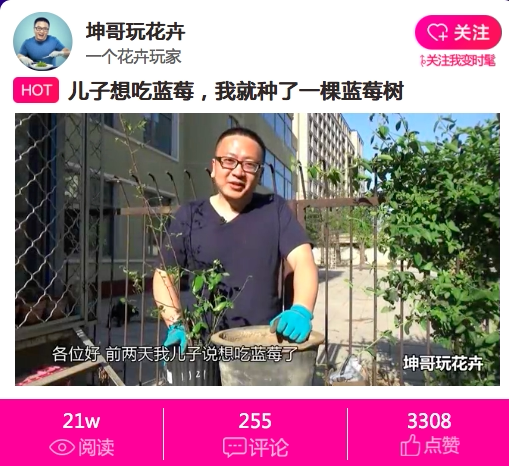 比如TOP7来自坤哥玩花卉的《儿子想吃蓝莓,我就种了一棵蓝莓树》▼