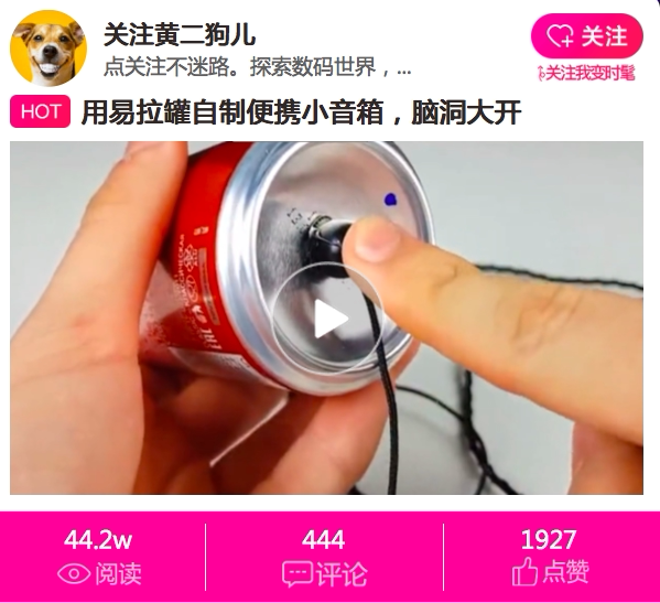 比如本期TOP1,来自关注李狗儿的便携式音箱制作教程视频《用易拉罐自制便携小音箱,脑洞打开》